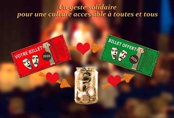 Inspiré des « cafés suspendus » nés en Italie, ce dispositif vous propose, spectatrices et spectateurs, tout au long de l’année ou au moment de l’achat de votre place de théâtre, de glisser quelques euros dans la « tirelire solidaire » située à l’accueil. Dès que 5 € seront réunis, un billet suspendu sera édité et mis à disposition de celles et ceux qui en ont besoin.